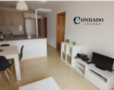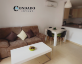 The apartment is sold fully furnished, including white kitchen appliances. The soft colour scheme creates the right homely atmosphere. The decoration makes you feel comfortable the minute you walk in through the door. Here you will find a sofa, dining room table and chairs, a TV and unit, and a coffee table, creating a warm and homely environment. Air Conditioning is installed in the living room, master and second bedroom.